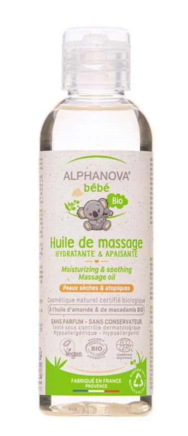 Aceite de masaje sin perfume con certificado ecológico para el masaje y la hidratación de la piel del bebé y los niños.