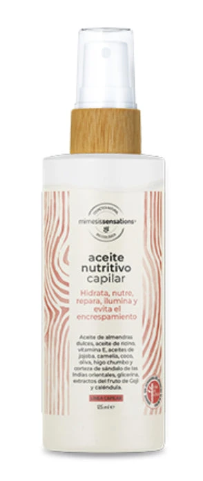 En ocasiones, un buen champú y una mascarilla reparadora no son suficientes para conseguirlo. Los aceites capilares son una solución efectiva paraayudar a su reparación y mantener un buen estado. El aceite nutritivo capilar de Mimesis Sensations es un tratamiento eficaz y natural con una fórmula a base de diferentes aceites que actúan reparando los daños, mejorando la elasticidad de la fibra capilar y reduciendo el encrespamiento, a la vez que nutren e hidratan el cabello aportando un brillo natural.