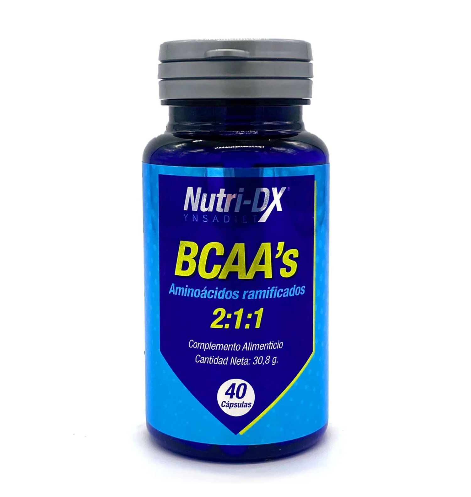 BCAAs 2:1:1 (L-Leucina, L-Isoleucina, L-Valina), Antiaglomerantes (Fosfatos de calcio, Celulosa, Estearato magnésico y Óxido de silicio), Almidón de maíz. Cubierta de la cápsula: Gelatina y agua.