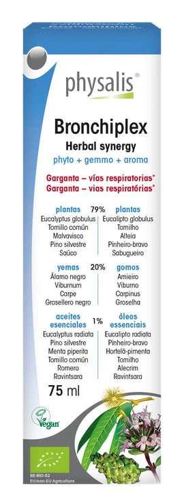 ¿Mucosidad en la nariz, golpes de tos o sensación de fatiga permanente? Nuestro organismo debe sufrir cada año los pequeños males del invierno. La Madre Naturaleza posee remedios naturales que ayudan a prevenirlos y combatirlos. Bronchiplex contiene eucalyptus, tomillo común, malvavisco, pino silvestre, saúco y viburnum, que ejercen un efecto suavizante en la garganta y las vías respiratorias, liberando así la respiración. El álamo negro, la menta piperita y el romero apoyan nuestra resistencia natural.