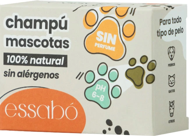 Essabó Champú mascotas es un champú sólido 100% natural ideal para perros, gatos y otro tipo de animales domésticos. Gracias a una formulación rica en carbohidratos, proteínas, sales minerales y vitaminas enriquecida con manteca de mango, aceite de ricino, argán y jojoba, limpia y suaviza el pelo respetando la piel del animal.
