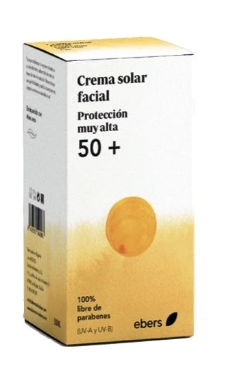 Crema solar facial 50+, es una emulsión de uso diario muy evanescente, diseñada con filtros químicos y físicos fotoestables y enriquecida con Aloe vera, protege frente a las radiaciones UVA y UVB responsables del fotoenvejecimiento cutáneo y de las quemaduras solares, proporcionando una protección diaria óptima en zonas fotoexpuestas.