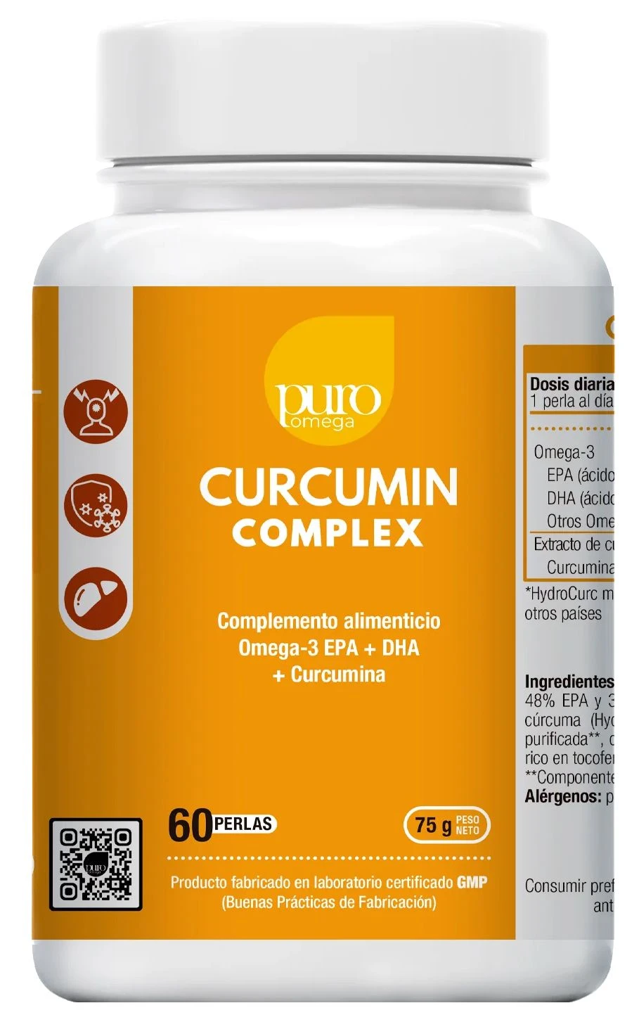 La fórmula Puro Omega Curcumin Complex ofrece una sinergia preventiva y terapéutica que combina los efectos antiinflamatorios del Omega-3 (EPA y DHA) con la gran eficacia antioxidante y antiinflamatoria de la curcumina.