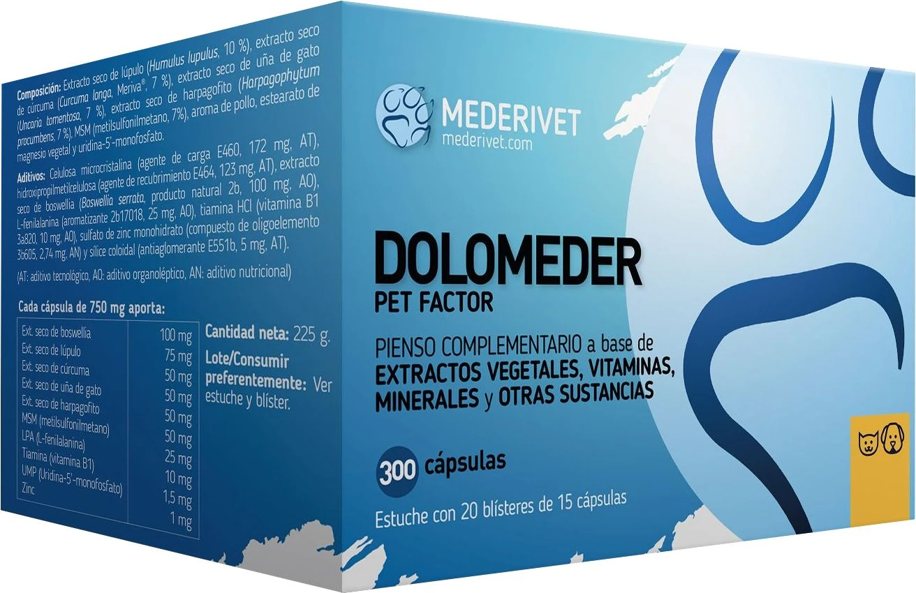 Dolomeder Pet Factor está indicado para aliviar el dolor causado por procesos que incluyan cualquier tipo de inflamación (otitis, artrosis, artrisis, dermatitis, colitis, dolor post quirúrgico…). Entre sus ingredientes destacan cinco extractos naturales de plantas (cúrcuma, boswelia, uña de gato, harpagofito y lúpulo) con excelentes propiedades anti inflamatorios.