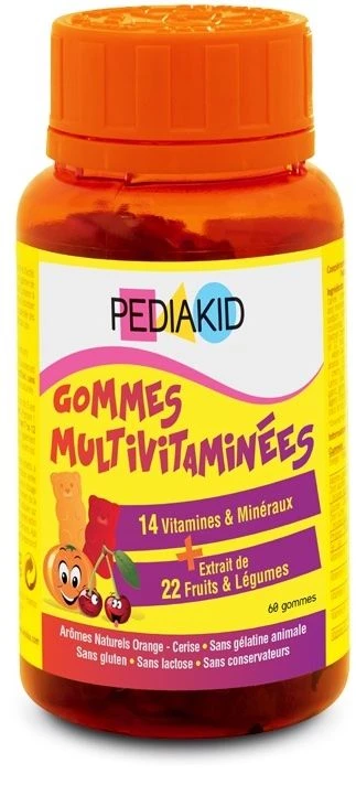 p>Pediakid ® Gominolas Multivitaminas está desarrollado a base de pectina de manzana. Es un suplemento dietético en forma de gominolas a base de un extracto patentado de 22 de Frutas y Verduras, vitaminas A, C, E, K, B1, B2, B3, B5, B6, B8, B9, B12, selenio y zinc. Pediakid® Gomiolas Multivitaminas asocia 14 vitaminas y minerales y un extracto patentado de 22 de Frutas y Verduras (Oxxynea®) para asegurar la ingesta de micronutrientes esenciales a los niños.