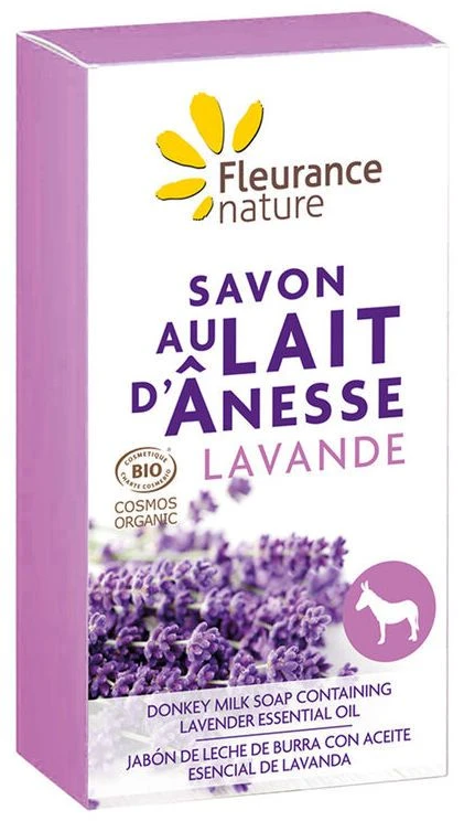 Jabón de Leche de Burra con Aceite Esencial de Lavanda de Fleurance Nature es enriquecido con leche fresca de burra certificada biológica y perfumado con aceite esencial calmante de lavanda, este jabón se adapta a todo tipo de pieles, incluso las más sensibles, y les aporta todo el confort que necesitan, gracias a su suave fórmula.