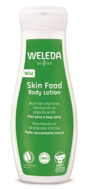 Loción Corporal Skin Food de Weleda Combinando todo el poder restaurador y fortalecedor de la barrera de humedad de la gama Skin Food con una textura ligera y cremosa, la loción corporal Skin Food hidrata la piel mientras la envuelve en una capa de aceites protectores.