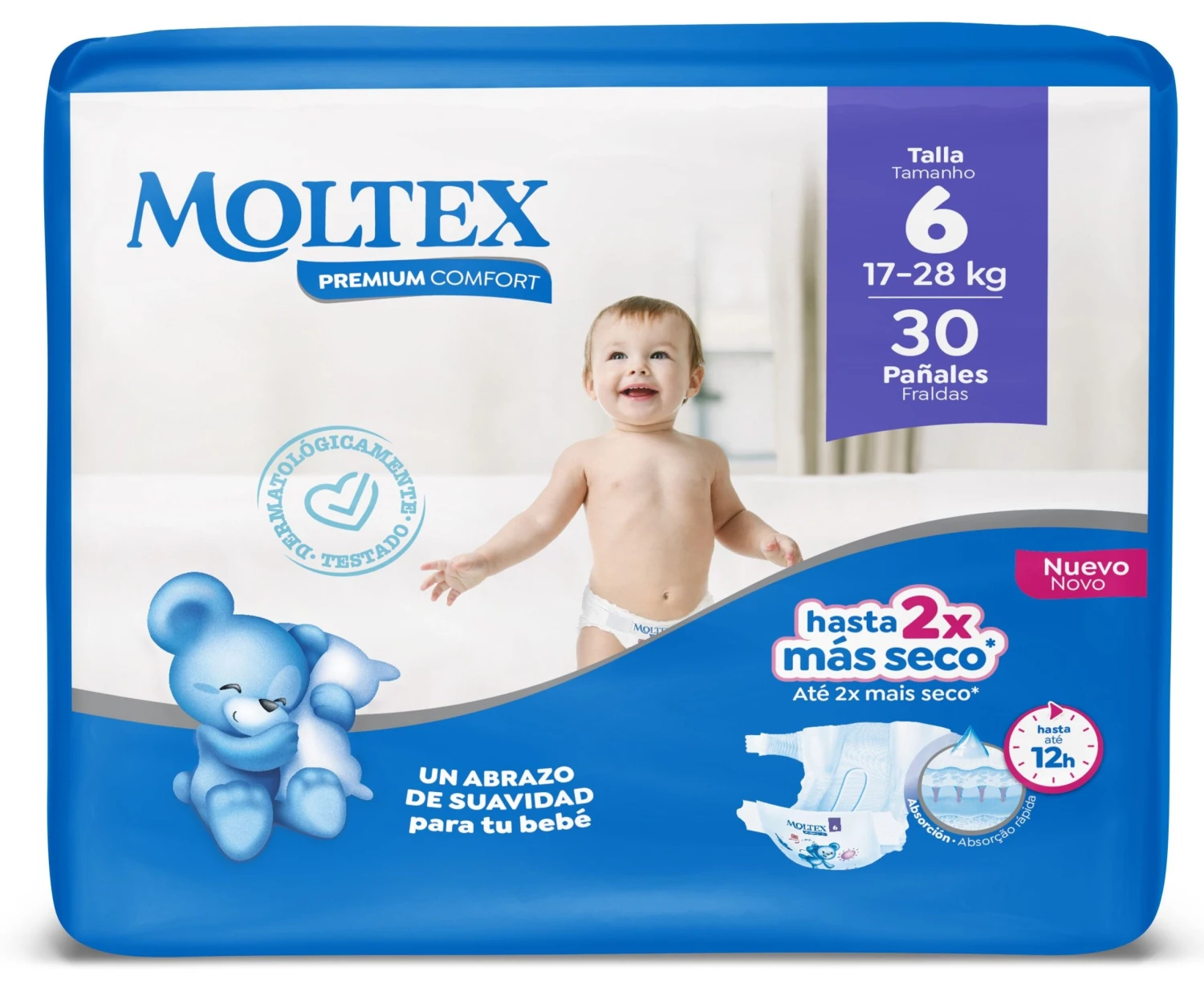 Los Pañales Premium Comfort Talla 6 XL de Moltex están especialmente diseñados para bebés de entre 17 y 28 kg, son hasta 2 veces más secos que antes, proporcionando hasta 12 horas de protección.