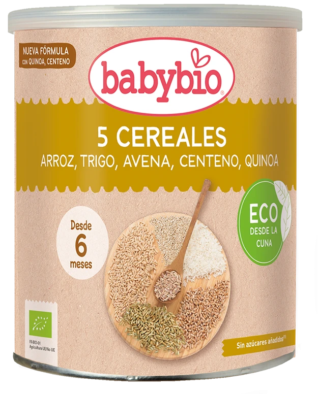 La papilla de 5 cereales: Arroz, Trigo, Avena, Centeno y Quinoa de Babybio, están fabricados con cereales de cultivo 100% ecológicos. Se trata de unos cereales cargados de nutrientes, que combinan todo el sabor del trigo, la avena y el arroz, tres cereales con múltiples beneficios para que los más peques de la casa crezcan sanos y fuertes.
