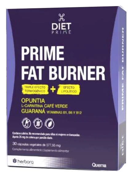 Prime Fat Burner de Diet Prime, con acción termogénica, aumenta el metabolismo, estimula la eliminación de grasas y mejora la actividad física. En formato cápsulas, está elaborado a base de opuntia, L-carnitina, café verde, guaraná y vitaminas B1, B6 y B12, una combinación de ingredientes que ayudan a reducir la acumulación de grasa en el cuerpo mediante un aumento del metabolismo basal a la vez que mejoran el estado de ánimo y la energía.