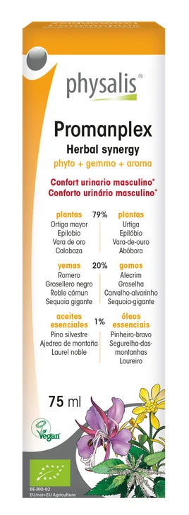 Son numerosos los hombres que, a partir de los 45 años, se enfrentan a problemas urinarios como por ejemplo una micción demasiado frecuente pequeñas cantidades de orina, necesidad urgente de orinar… Physalis Promanplex contiene epilobio, vara de oro y calabaza que contribuyen al confort urinario y a la salud de las vías urinarias en el hombre. Además, la ortiga favorece la purificación interna y la eliminación de agua por los riñones. Finalmente la ajedrea de montaña, el grosellero negro y el laurel, ayudan a proteger las células contra los radicales libres.