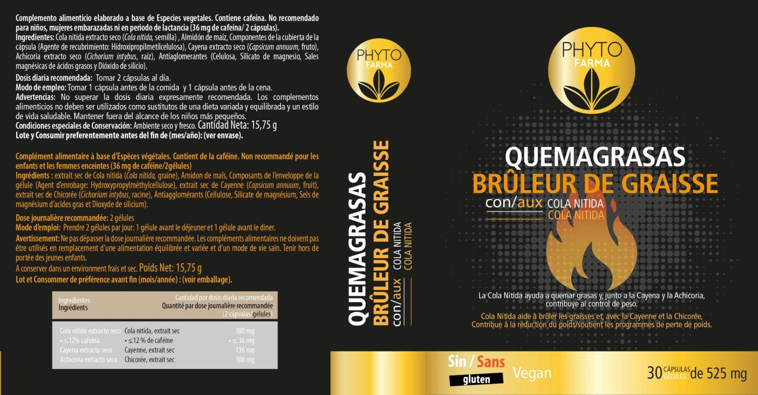 Quemagrasas de Phytofarma es un complemento alimenticio con cola nitida, cayena y achicoria, está diseñado para favorecer la quema de grasas. La cola nitida, rica en cafeína, estimula el metabolismo. La cayena puede aumentar el gasto calórico, y la achicoria ayuda a controlar el apetito. Ideal para dietas de control de peso.