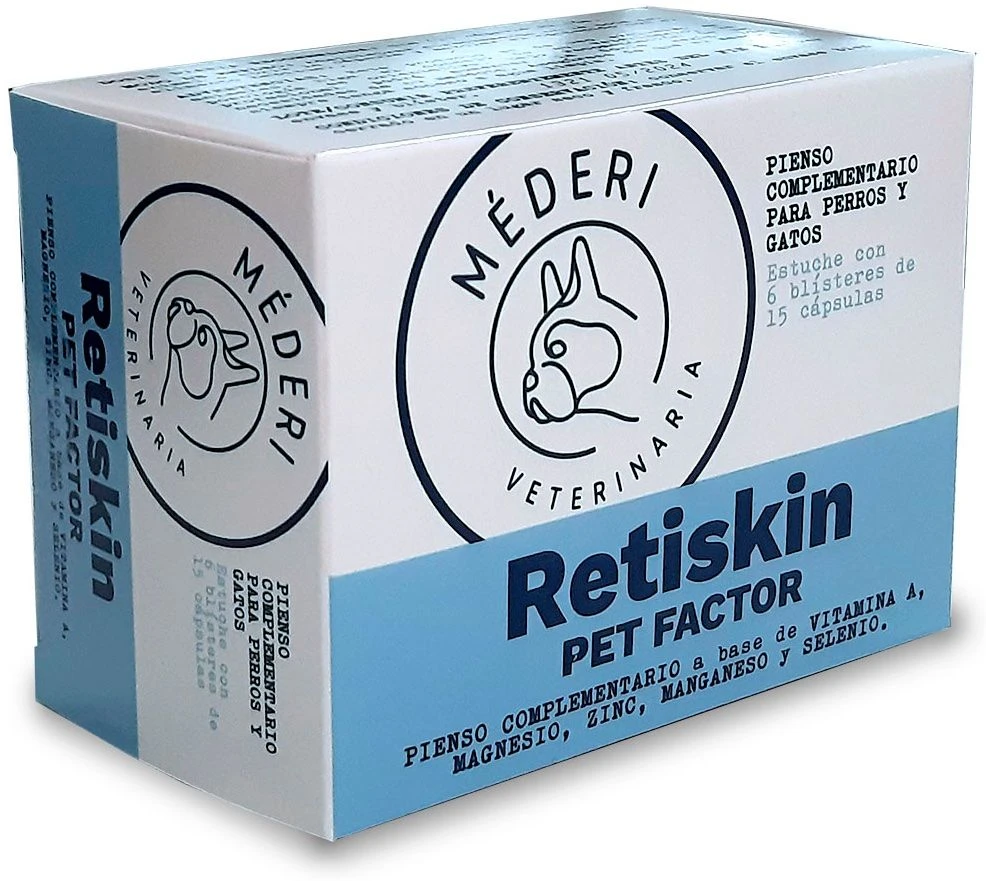 Retiskin Pet Factor es un pienso complementario para perros y gatos a base de vitamina A, magnesio, zinc, manganeso y selenio.