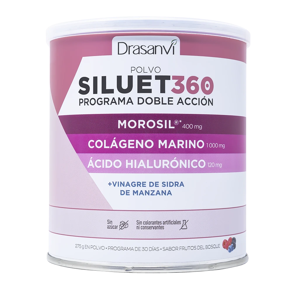 Siluet 360º polvo ha desarrollado una fórmula única de Adelgazamiento y Belleza que combina el colágeno de origen marino, ácido hialurónico y Morosil®, 3 de los activos de moda para la belleza de la piel y un programa completo de adelgazamiento.