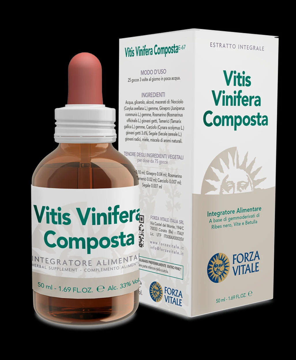Agua, glicerol, Alcohol, macerados de: Grosellero negro (Ribes nigrum) yemas, Vid (Vitis vinifera) yemas 28%, Pino (Pinus montana) yemas, Abedul (Betula verrucosa) yemas, Abeto blanco (Abies pectinata) yemas, miel, mezcla de aromas naturales.
